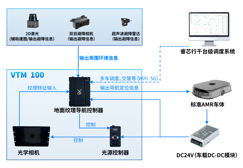 VTM 100(Visual Texture Module)是睿芯行推出的基于視覺的地面紋理導航模組。該模組由光學相機和地面紋理導航控制器組成,通過光學相機輸出地面紋理特征,搭配地面紋理導航控制器產品實現無需地面任何標識物,輸出定位信息。可支持瓷磚、水泥、金剛砂等材質地面,實現基于視覺地面紋理的導航定位。VTM100是標準化模組,可基于客制多款AMR標準車型,快速形成地面紋理導航AMR整車產品,可支持最高速度2m/s,定位精度±5mm,場景無憂,無懼白天黑夜。